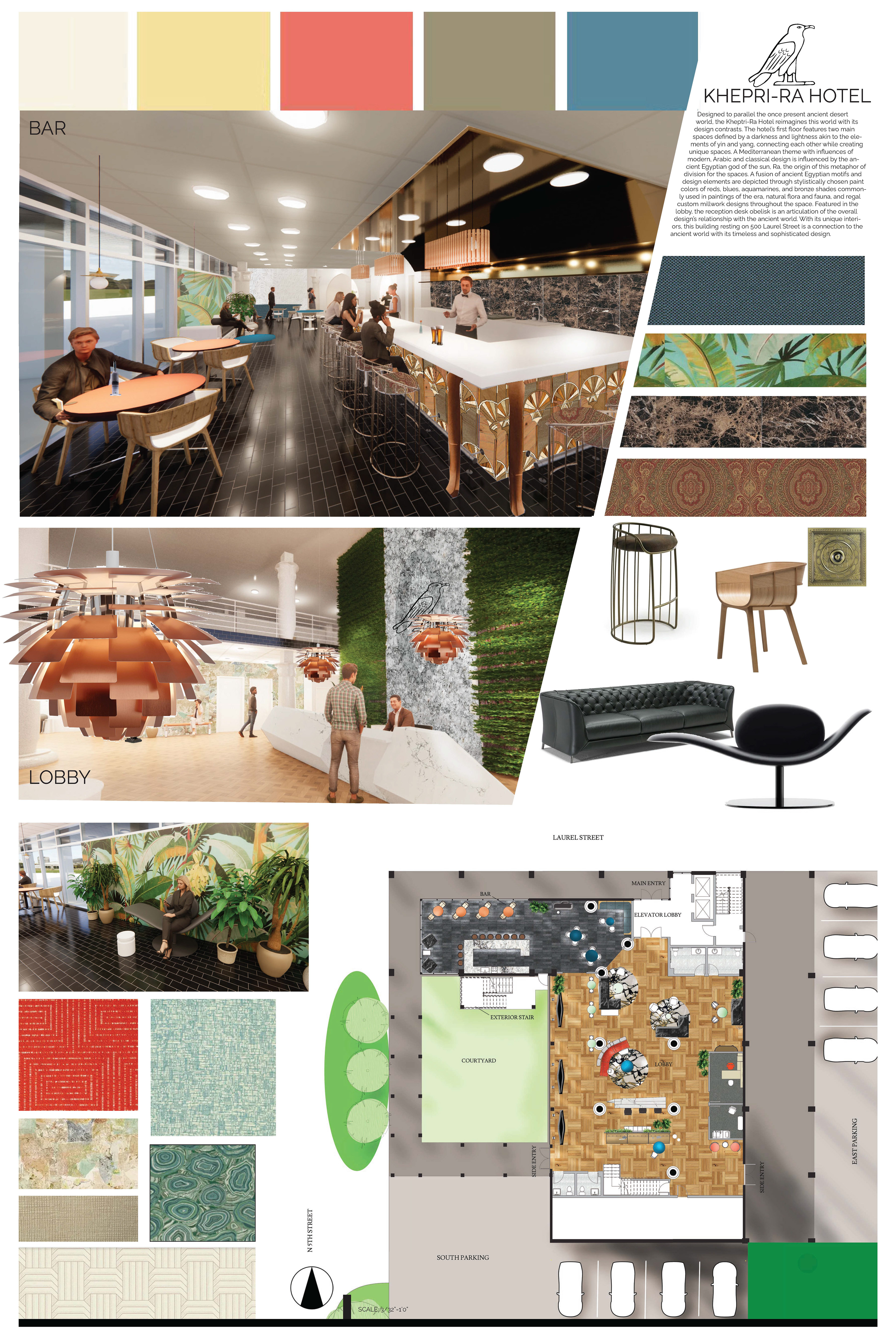 Designed as a boutique hotel project, this design focuses on the duality of the bar and lobby to create a flowing Egyptian theme of dark versus light. Works created with Indesign, Photoshop, Revit and Enscape.